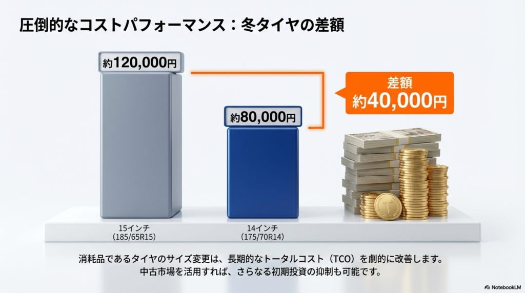 スタッドレスタイヤのゴムの寿命は、どんなに良いものを買っても概ね3年〜5年程度です。車を10年間保有した場合、最低でも2回〜3回は買い替えのタイミングが訪れることになります。その都度3万円以上の価格差が生じるわけですから、長期的なトータルコスト(TCO)で見ると、14インチ化による節約効果は10万円を超えることも珍しくありません。維持費をとにかく安く済ませたい、という実用重視のオーナーにとって、インチダウンは迷わず選択すべき合理的なカスタマイズだと言えますね。