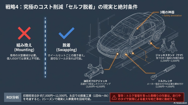 究極の費用削減戦略として、外部の業者に一切依存せず、いかなる工賃の割増や作業拒否のリスクも負わない「自分で交換する(セルフ交換)」という選択肢もあります。ただし、これが可能なのは、既にホイールにタイヤが組み込まれている状態のセットを丸ごと付け替える「脱着作業(夏タイヤ⇔冬タイヤの履き替えなど)」に限られる点に注意してください。