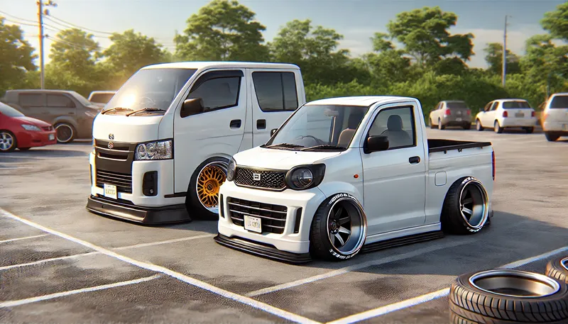 ハイゼットトラックの見た目をスタイリッシュにしたり、走行性能を向上させたりする定番のカスタムとして「インチアップ」があります。これは、タイヤの外径をほとんど変えずに、ホイールの径(インチ)だけを大きくする手法で、12インチから13、14、15インチへと変更します。
