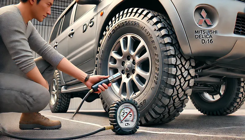 デリカD:5の純正指定空気圧は240kPa前後ですが、LTタイヤを履く場合は300kPa〜350kPa(3.0〜3.5kgf/cm2)程度まで高めるのが一般的です。