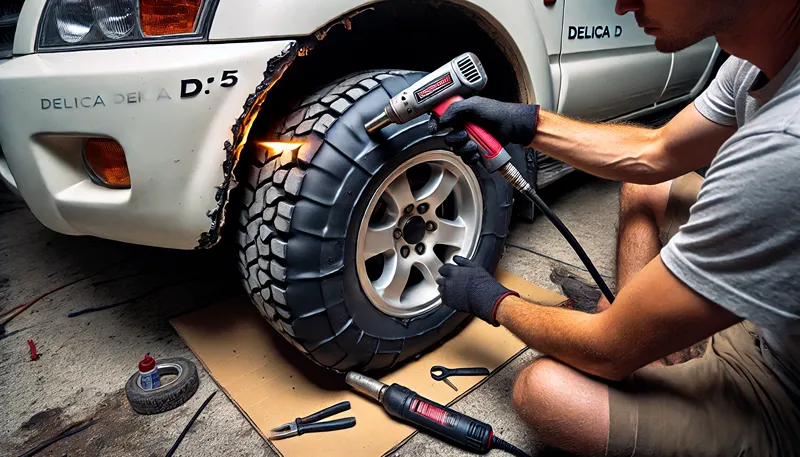 フロントの干渉は加工で何とかなりますが、実はもっと厄介で、デリカD:5特有の「構造上の弱点」とも言える場所があります。それが「左リアタイヤの前方内側」です。